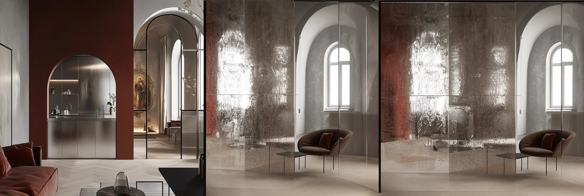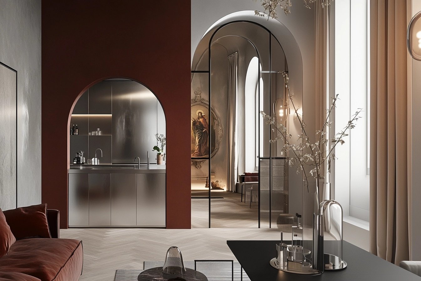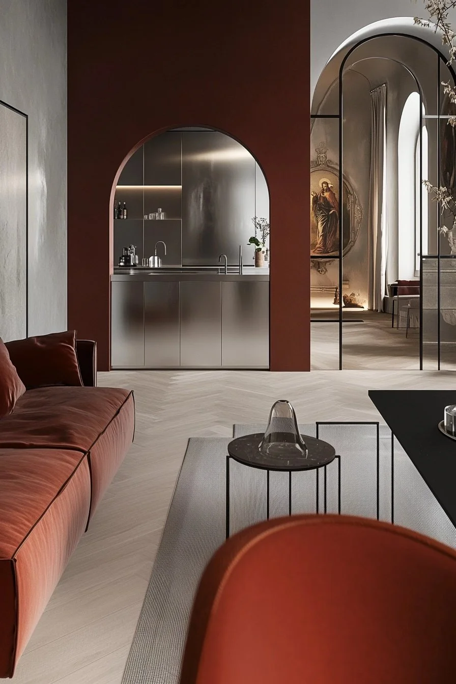The vaulted ceilings, stone walls, stained-glass windows, and murals remain intact, complemented by Italian mid-century elements, antique pieces, and subtle ecclesiastical details. Materials like concrete, steel, velvet, and corduroy, paired with a color palette of gray, white, reddish-brown, and black, create a harmonious balance of warmth and modernity.