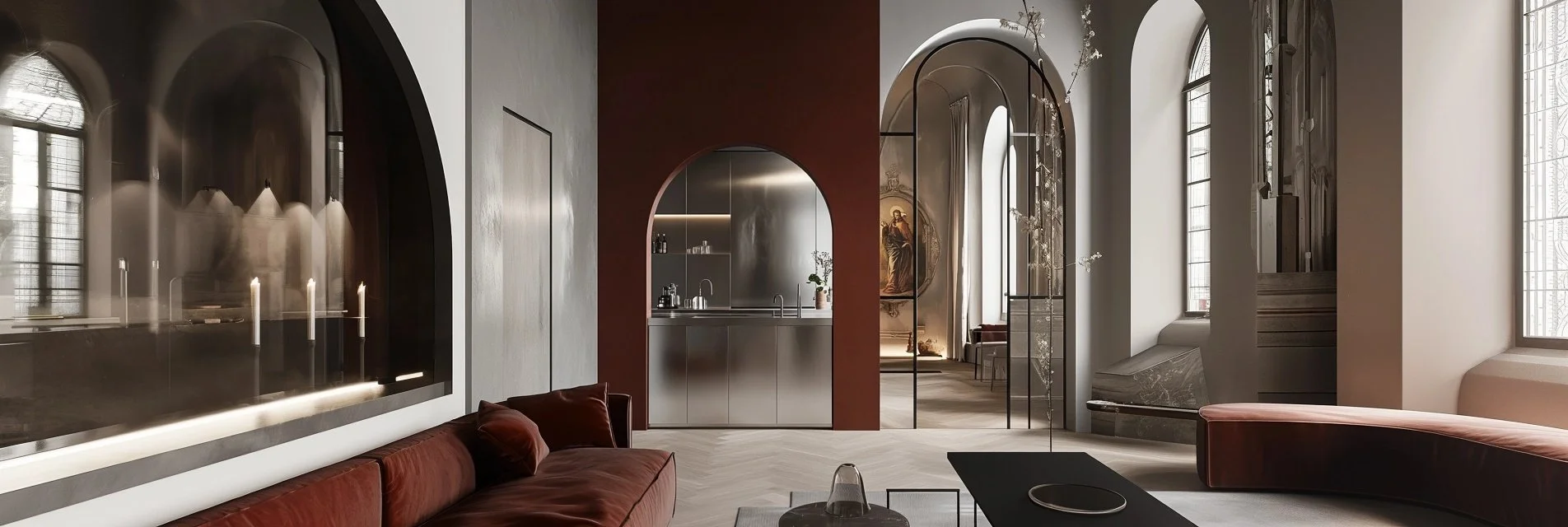 »Sometimes, a space doesn’t ask to be changed – it asks to be understood. In this project, a former church, the task was not to reinvent, but to listen. The aim was to preserve the soul of the place and carry it gently into a new context. Rather than creating contrast, the concept focuses on connection – between old and new, material and mood, space and memory. Color plays a central role: carefully layered palettes that echo what already exists while adding quiet tension and depth.