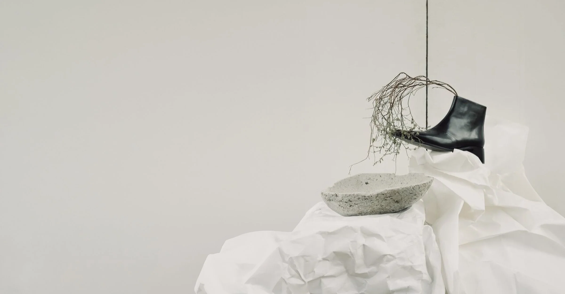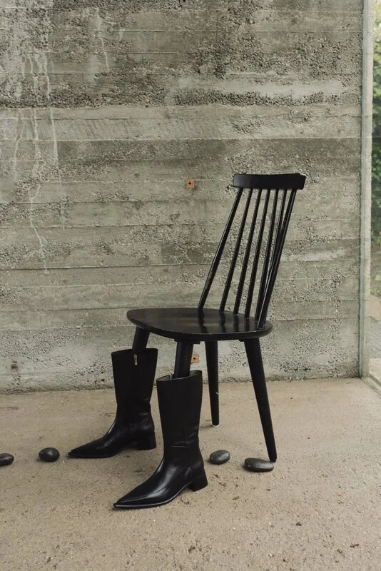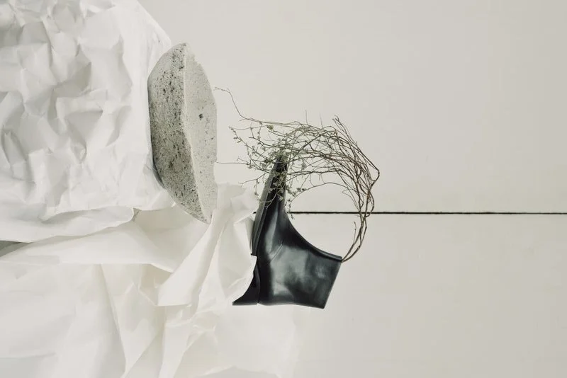 A boot seamlessly fused with the leg of a chair, as if it had always belonged there. Shoes entirely wrapped, mysteriously concealed yet undeniably present. Pairs reclining on delicate Japanese plates, blurring the boundary between fashion and still life. Each arrangement transforms the shoes into more than just accessories—they become elements of a visual narrative, studies in balance, composition, and materiality.